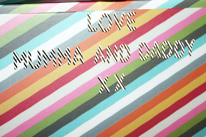 To really make this box our own, I personalised it with these gorgeous gold and white striped stickers from The Range (another great place for unique and quirky buys, and loads of crafty bits!). I of course put stickers on the top of the box, but as I had so many, I decided to add a little note to the underneath of the box too.