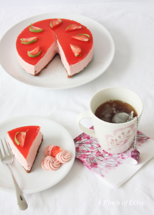 This recipe is from my Japanese friend, Reiko, she made it as layer cake (green tea cake+ agar agar+ strawberry mousse) it was fantastic. I replicated only mousse part with thin eggless chocolate cake and strawberry jelly/mirror on top! The mousse is very special, not too sweet with tad bit of sourness, smooth and rich. If you all are wondering what is that leaf? I have no idea except for the fact it’s edible. The name was written in Finnish which obviously I forgot to note it down! Basically used them to bring some contrast. Enjoy the cake till the blogger part in me wakes up again