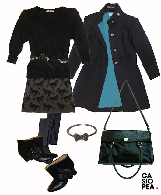 Lu: saco con perlitas, cinturón trenzado, vestido largo de seda y botas, todo de Casiopea