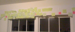 It has become part of my daily routine now to add, subtract, and reorganize these sticky notes from my wall. (Truth be told, there are more on the wall now than there were when I took this photo, which means only that I have some crap to get rid of.)