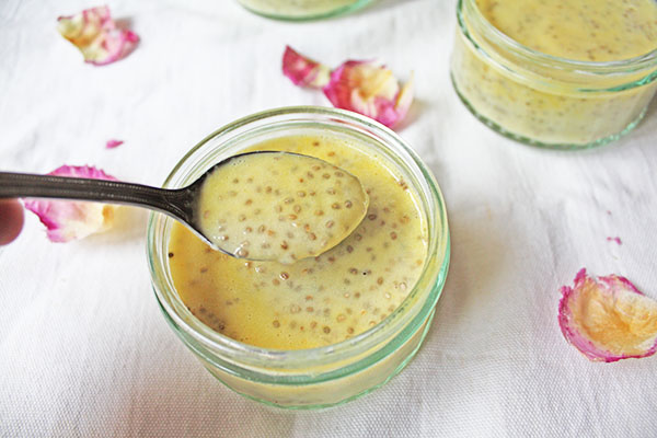 These little pots of goodness are nourishing and tasty at the same time. They are pretty versatile too, they make a really delicate dessert at the end of a meal as they are light and refreshing but they are also great to have for breakfast. I often have a couple of tablespoons on my morning oats or add them to smoothie for added creaminess and extra goodness. Chia seeds are a bit of a superfood; similar to flax seeds they contain lots of Omega 3 and when left over night they plump up and can help to thicken liquids. I like to add turmeric to these pots too, the spice contributes to the vibrant colour and is also full of therapeutic properties (its great for the immune system).