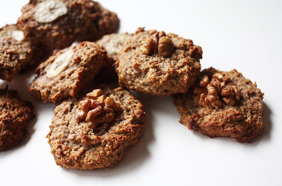 These cookies smell so yummy when they are baking. They taste great when they are cool, but they are pretty special straight out of the oven. We like to have these as a weekend breakfast with some fruit and coconut yogurt (a little like a pancake) but they are really lovely any time of the day. Packed full of oats and walnuts bound together with a banana and honey syrup. I love the combination of sweet banana and walnuts and hint of vanilla and honey. These are pretty good at curbing my sweet cravings too!