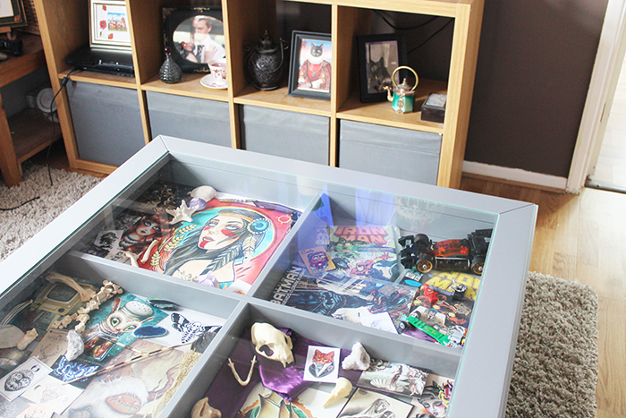 Now as you can see we have a split room with a grey and brown warm cosy feel. Approxmatey 90% of our furniture is IKEA as we love their storage systems and designs. They're so simple but can have a great effect in a room. In mean our coffee table is probably my favourite item, filled with bones and art from Tattoo Conventions, and LEGO and comic books for Dann!