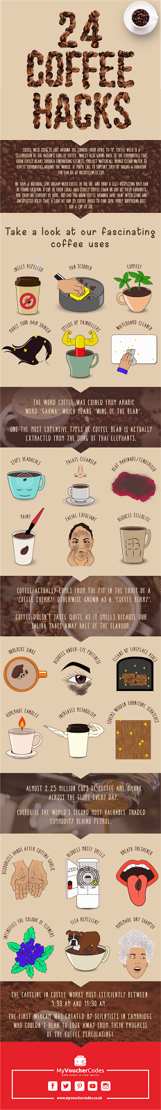 You guys know I love coffee right? If you didn't where have you been? I covered some of my love in my recent post with Mettricks. So it only seems right that I share this infographic all about coffee with you in collaboration with MyVoucherCodes. As it's Coffee Week UK (11th -17th April) why not celebrate with some coffee hacks and a cuppa!