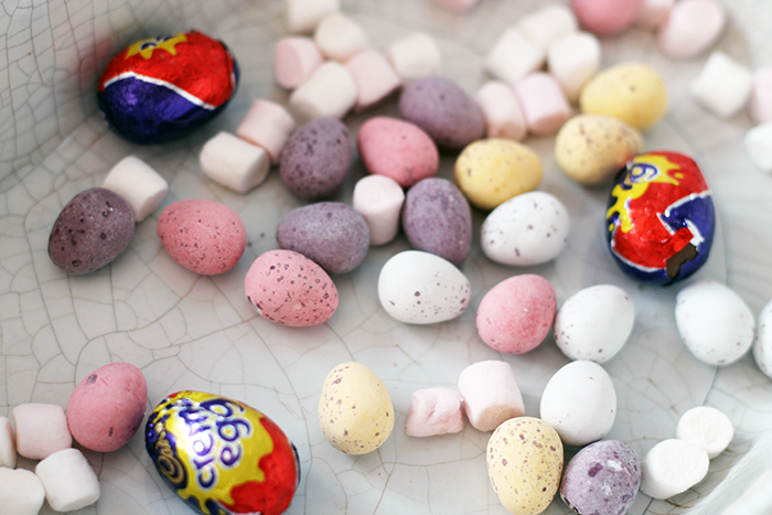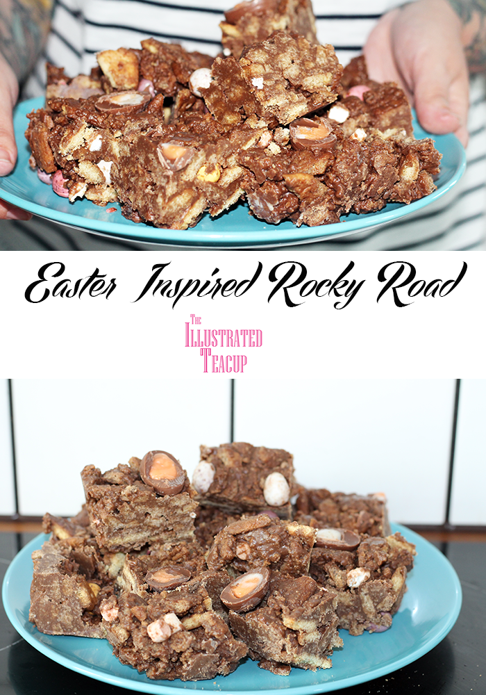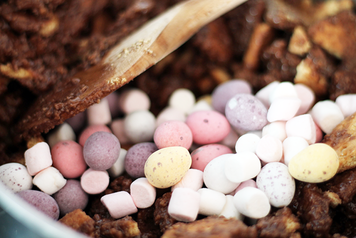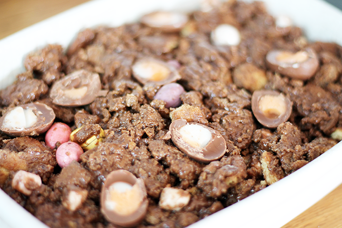 It's essentially the same recipe as before (linked above) but before you add into the dish, mix in a handful or two of mini marshmallows, and a bag of Mini Eggs. Once pressed into the dish, grab a bag of Mini Creme Eggs, cut them in half and push the halves into the top of the mix. Then place in the fridge for a few hours to fully set.